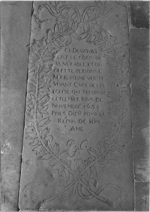 Epitaphe gravée : CI DESSOUS / GIST LE CORPS DE / VENERABLE ET DIS-CRETTE PERSONNE / ME JEROSME VERITE / VIVANT CVRE DE CES / EGLIZE QUI TRESPASSA / LE PREMIER IOUR DE / NOVEMBRE 1634 / PRIEZ DIEV POVR LE / REPOS DE SON / AME.