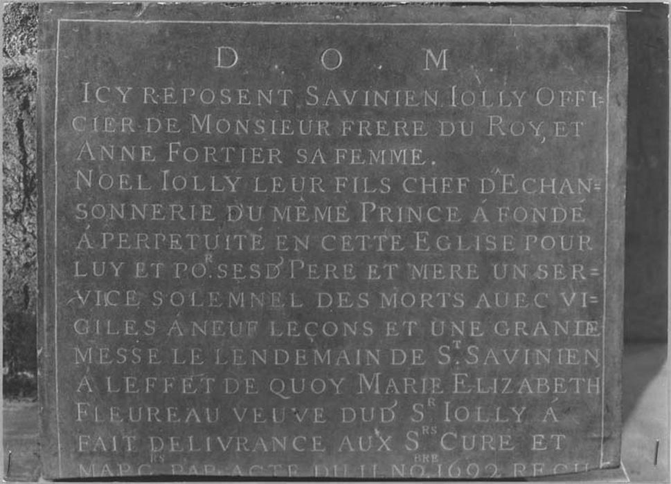 Epitaphe gravée : D. O. M. / ICY REPOSENT SAVINIEN IOLLY OFFI- / CIER DE MONDIEUR FRERE DU ROY ET / ANNE FORTIER SA FEMME. / NOEL IOLLY LEUR FIS CHEF D'ECHAN- SONNERIE DU MEME PRINCE A FONDE / A PERPETUITE EN CETTE EGLISE POUR / LUY ET OR. SES DS. PERE ET MERE UN SER- / VICE SOLEMNEL DES MORTS AUEC VI- / GILES A NEUF LECONS ET UNE GRANDE / MESSE LE LENDEMAIN DE ST. SAVINIEN / A LEFFET DE QUOY MARIE ELIZABETH / FLEUREAU VUEVE DUDT SR. IOLLY A / FAIT DELIVRANCE AUX SRS. CURE ET / MAPCRS PAR ACTE DU II NOBRE. 1692 RECH [épitaphe interrompue]