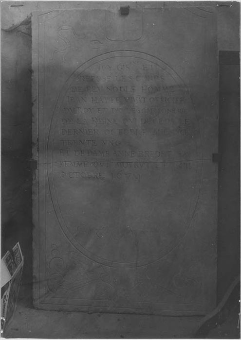 Epitaphe gravée : ICY GISENT ET / REPOSE LES CORPS / DE FEV NOBLE HOMME / IAN HATTE VAVAT OFFICIER / DV ROY ET DE LES CHASONERIE / DE LA REINE QVI DE CET LE / DERNIER OCTOBRE MILSIXCE / TRENTE VNG / ET DE DAME ANNE BREDET SA / FEMME QVI MOVRVT LE XIII / OCTOBRE 1674.