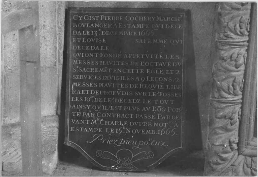Epitaphe gravée : CY GIST PIERRE COCHERY MARCHANT. / BOVLANGER A ESTAMPE QUI DECE / DA LE 13 DECEMBRE 1665 / ET LOVISE SA FEMME QVI / DECEDA LE / QVI ONT FONDE A PPETVITE LES / MESSES HAVLTES DE L'OCTAVE DV / ST. SACREMET EN CETTE EGLE, ET 2 / SERVICES DE VIGILES A 9 LECONS. 2 / MESSES HAVLTES DE REQIE LIBE / RAET DEPROFVDIS SVR LE FOSSES / LES IORS. DE LE DECEDZ LE TOVT / AINSY QV'IL EST PLVS AV LOG POR / TE PAR CONTRACT PASSE PAR DE / VANT ME. CHARLE DVPRE NOTRE. A / ESTAMPE LE 15E. NOVEMB. 1665. / Priez Dieu por. Eux.