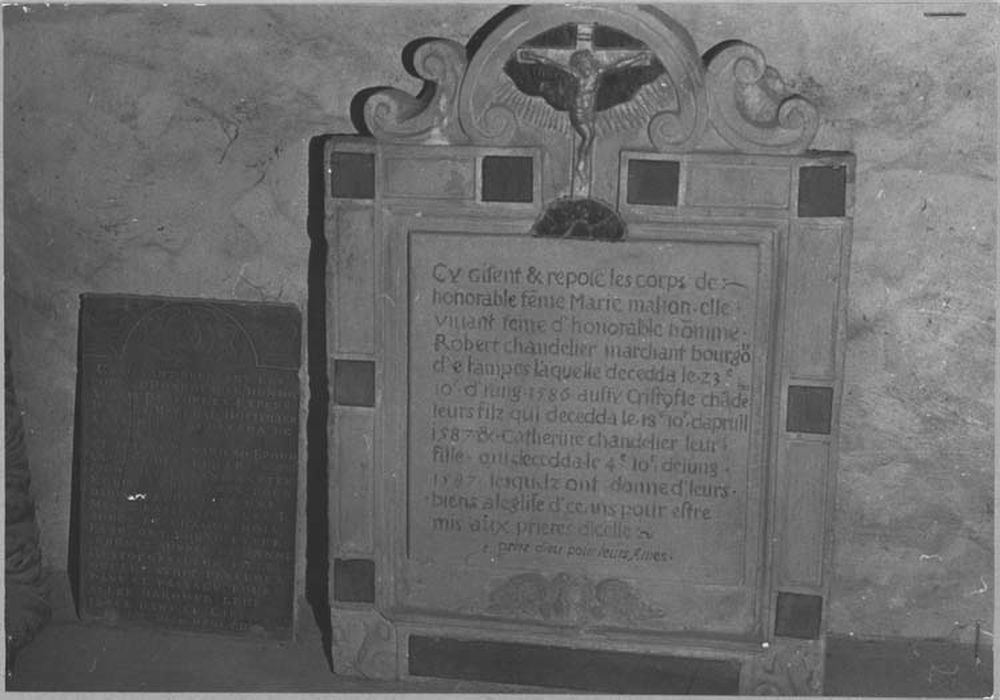Epitaphe gravée : CY Gifent & Repofe les corps de l' / honorable feme Marie malion elle / viuant feme d'honorable homme / Robert chandelier marchant bourgois / d'etampes laquelle decedda le 23e / ior. d'iung 1586 auffi criftofle chadeier : leurs filz qui decedda le 18e ior. dapruil / 1587 & Catherine chandelier leur / fille qui decedda 4e. Ior. dejung / 1587 lesquelz ont donne d'leurs / biens aleglife d'ceans por eftre / mis aux pierres dicelle / priez dieu pour leurs Ames.