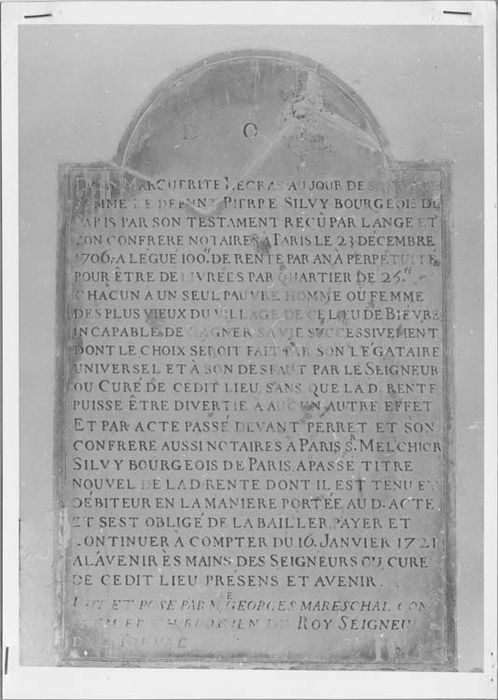 Inscription : DAME MARGUERITE LEGRAS AU JOUR DE SON DEUIL / FEMME DE DEFUNT PIERRE SILVY BOURGEOIS LANGE ET / SON CONFRERE NOTAIRES A PARIS LE 23 DECEMBRE / 1706, A LEGUE 100H. DE RENTE PAR AN A PERPETUITE / POUR ETRE DELIVREES PAR QUARTIER DE 25H. / CHACUN A UN SEUL PAUVRE HOMME OU FEMME / DES PLUS VIEUX DU VILLAGE DE CE LIEU DE BIEVRE / INCAPABLE DE GAGNER SA VIE SUCCESSIVEMENT / DONT LE CHOIX SEROIT FAIT PAR SON LEGATAIRE / UNIVERSEL ET A SON DESFAUT PAR LE SEIGNEUR / OU CURE DE CEDIT LIEU SANS QUE LA D. RENTE / PUISSE ETRE DIVERTIE A AUCUN AUTRE EFFET / ET PAR ACTE PASSE DEVANT PERRET ET SON / CONFRERE AUSSI NOTAIRES A PARIS SR. MELCHIOR / SILVY BOURGEOIS DE PARIS, APASSE TITRE / NOUVEL DE LA D RENTE DONT IL EST TENU ET / DEBITEUR EN LA MANIERE PORTEE AU D. ACTE / ET SEST OBLIGE DE LA BAILLER, PAYER ET / CONTINUER A COMPTER DU 16 JANVIER 1721 / A L'AVENIR ES MAINS DES SEIGNEURS OU CURE / DE CEDIT LIEU PRESENS ET AVENIR. / FAIT ET POSE PAR ME. GROREGES MARESCHAL CONUR. / PREM ET CHIRURGIEN DU ROY SEIGNEUR / DE BIEVRE.
