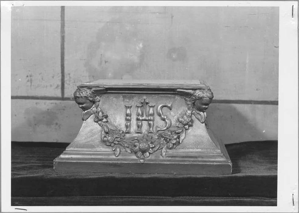 Décor de guirlandes de fleurs ; têtes d'angelots aux angles et monogramme du Christ.