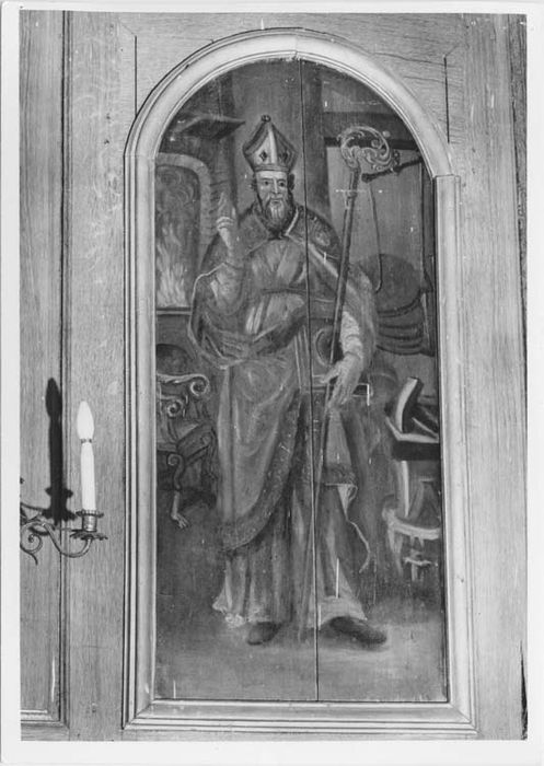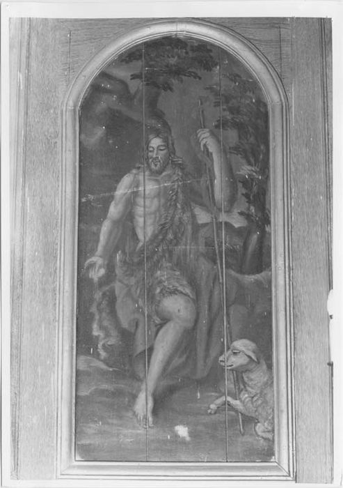 3 panneaux peints : panneau de droite : Saint Eloi ; panneau de gauche : Saint Jean-Baptiste ; panneau central dans la partie supérieure : colombe du Saint-Esprit. Les panneaux sont constitués de planches de bois verticales assemblées (2 pour saint Eloi et 3 pour saint Jean-Baptiste).