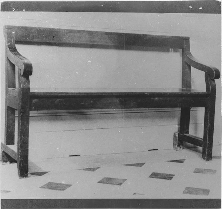 Un banc sur la tribune et un banc dans la nef de l'église, à droite en entrant.