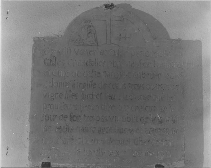 L'inscription rappelle la mémoire de Gilles Chandelier, curé de la paroisse, qui fit un don à l'église le 23 août 1611.