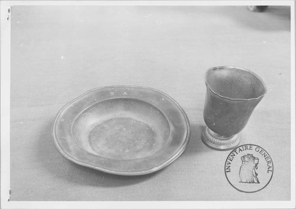 Monogrammes sous le gobelet : on distingue de chaque côté du centre du fond, les deux mêmes empreintes : monogrammes de lettres entrelacées, surmontant un P. Près du bord du pied, plus petits, monogrammes des deux lettres portées sur l'écuelle.
