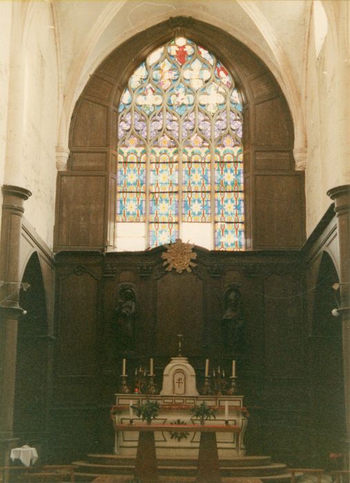 Maître-autel en bois peint blanc et or, tabernacle en marbre blanc. Autel en forme de gloire ; motif central de la colombe dans une gloire.