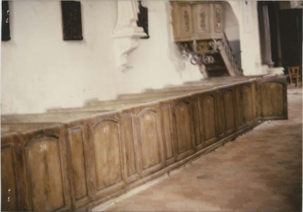 Bancs d'un seul tenant fermés par une ou deux portes ; panneaux moulurés et cintrés dans le haut ; angles droits.