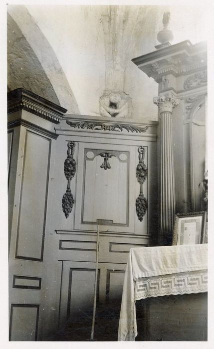 Bel ensemble, avec motif central accompagné de panneaux latéraux, qui ferment les bas côtés. entablement très décoré, frise avec arabesques sculptées aux volutes élégantes.
