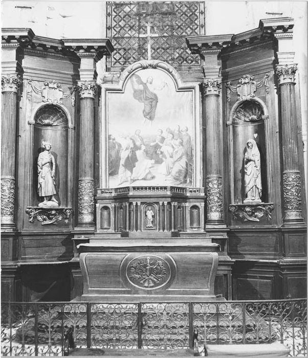 Retable faisant corps avec l'autel, comportant quatre colonnes cannelées à chapiteau de type corinthien, surmontées d'une corniche sculptée à modillons, avec motifs sculptés et dorés de rinceaux et feuillages à la base ; tabernacle architecturé également peint et doré, comptant six colonnettes à chapiteaux corinthiens et bases peints en doré, et cinq niches dont une en façade contenant une statuette de Dieu tenant un globe céleste dans la main gauche (cité dans l'inventaire de 1906).