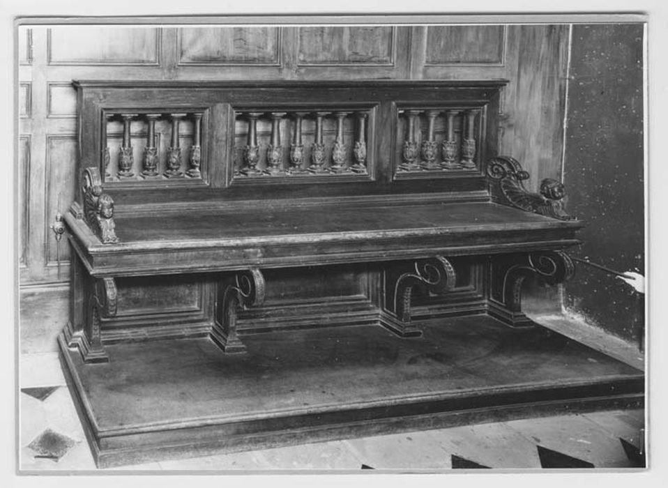 Dossier à balustres ; siège reposant sur quatre consoles en volutes ; pieds en forme de consoles reliés par des panneaux verticaux à l'arrière ; accotoirs en forme de séraphins.