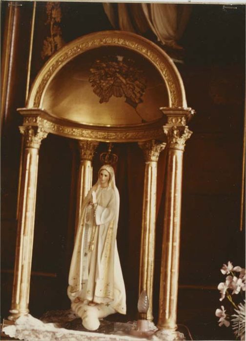 Quatre colonnes corinthiennes supportent un demi dôme orné d'un décor intérieur représentant l'agneau pascal et deux têtes d'anges dans un motif rayonnant. Bois doré ; plâtre doré ; traces de peinture rouge.