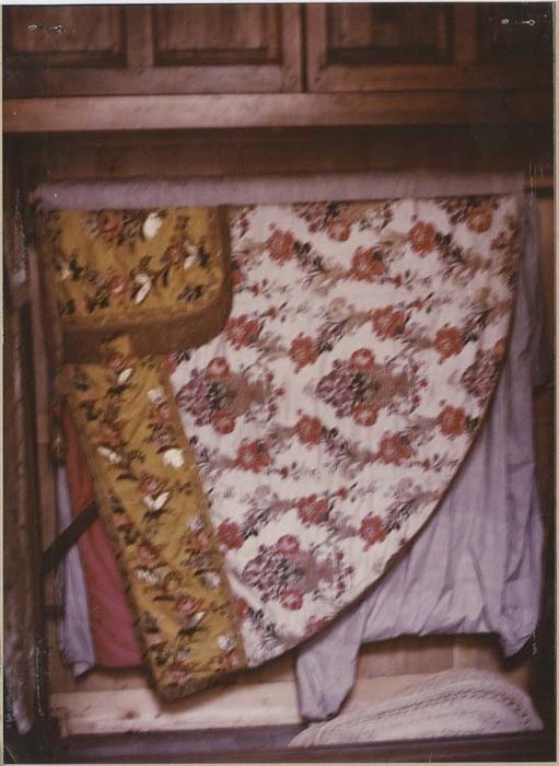 Chape en tissu blanc à grosses fleurs rouges et feuillages bruns avec chaperon et bande de tissu brun à fleurs rouges.