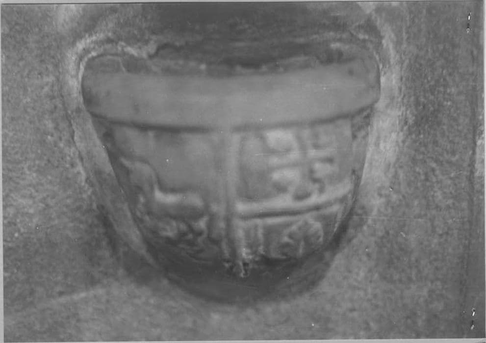 En forme de godet, creusé dans la pierre, et orné de cannelures ; porte sur une partie antérieure un écusson avec des armoiries.