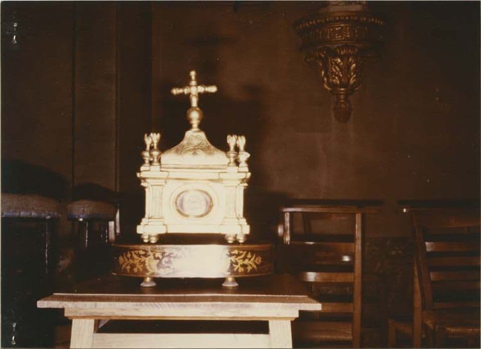 Reliquaire en bois doré ; globe et socle de citronnier ; face avant ornée de six pots à feu disposés à la verticale des six pieds appareillés deux à deux sur cette face ; couvercle amovible ; châsse renfermant un petit calvaire au socle en forme de croix et les instruments de la Passion ; Christ en croix et Madeleine au pied de la croix ; socle ovale du reliquaire en bois marqueté et protégé par un globe en verre.