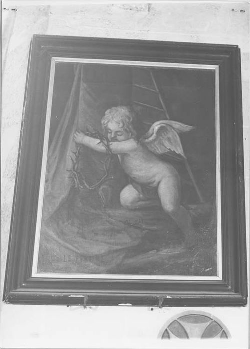 Un angelot étreint le pied de la croix avec, à son bras, la couronne d'épines du Christ. Derrière lui, l'échelle est encore posée contre la croix.