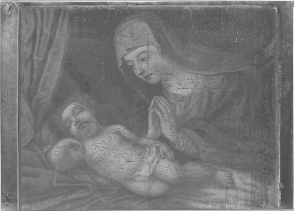 La Vierge est penchée, mains jointes en prière, sur son enfant qui dort.