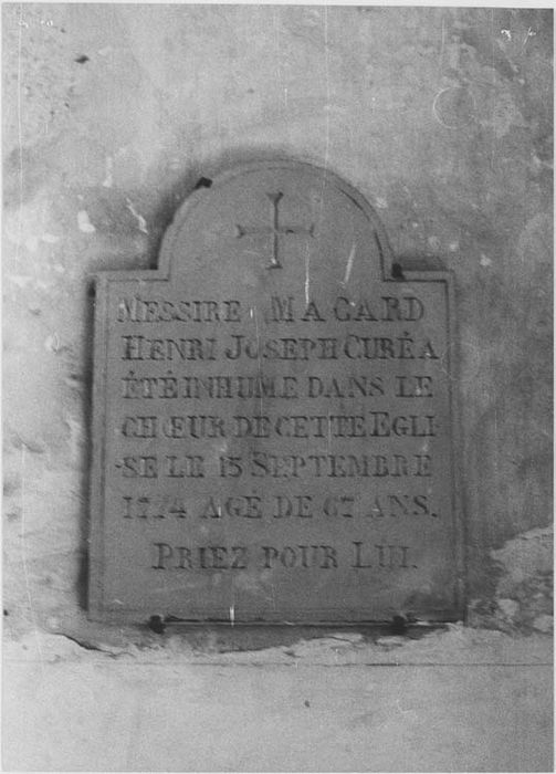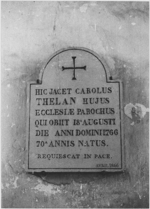 Date : avril 1866 (pour une des plaques) ; épitaphes gravées : MESSIRE MACARD / HENRI JOSEPH CURE A / ETE INHUME DANS LA / CHOEUR DE CETTE EGLI / -SE LE 15 SEPTEMBRE / 1774 AGE DE 67 ANS. / PRIEZ POUR LUI. ; HIC JACET CAROLUS / THELAN HUJUS / ECCLESIAE PAROCHUS / QUI OBIIT 18A AUGUSTI / DIE ANNI DOMINI 1766 / 70A ANNIS NATUS. / REQUIESCAT IN PACE. / AVRIL 1866.