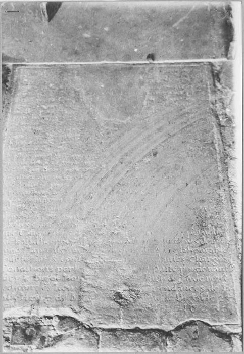 Citée par Guilhermy, 18e siècle : [...] Inscription devenue complètement fruste, composée de trente-trois lignes. Il s'agissait de donations et fondations par un personnage du nom de Foucques, qui paraît avoir été curé de Champlan, paroisse voisine de Saulx, acte passé en 1623, par-devant Andry Le Bigot, notaire tabellion et garde-notes héréditaire ès lieux et dépendances de la châtellenie de Montlhéry [...].