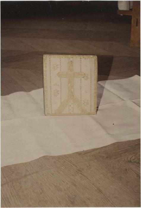 Bourse en tissu uni blanc à bandes tressées de fleurs.