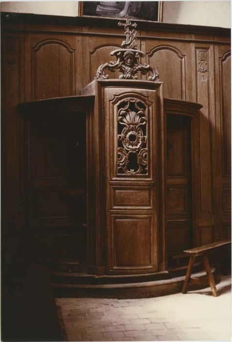 Gatineau, 2003 : Le décor Louis XV du petit confessionnal est assez saisissant. Au-dessus de la loge centrale, on reconnaît une croix enlacée par un serpent. [...] De chaque côté de la croix, on reconnaît les instruments de la passion : pelle, faux, fléau, billot. [...] une tête de mort très réaliste et couronnée de la palme de la victoire [...] datable du XVIIe siècle. On pouvait jadis, dans la loge centrale, voir un graffiti de soldat napoléonien. Il est aujourd'hui introuvable et semble avoir été détruit par mégarde lors d'une restauration énergique.