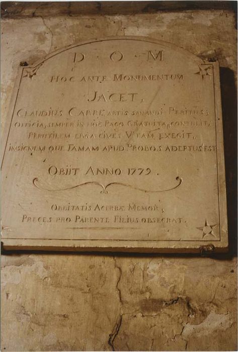 Inscription latine gravée : D . O . M . / HOC ANTE MONUMENTUM / JACET , / CLAUDIUS CARRE, ARTIS SANANDI PERITUS ; / OFFICIA, SIMPER IN HOC PAGO GRATUITA CONTULIT, / PERUTILEM ERGA CIVES VITAM EXGIT, / INSIGNEM TAMAM APUD PROBOS ADEPTUS EST / OBIIT ANNO 1779 . / ORBITATIS ACERBAE MEMOR, / PRICES PRO PARENTE FILIUS OBSTECRAT.