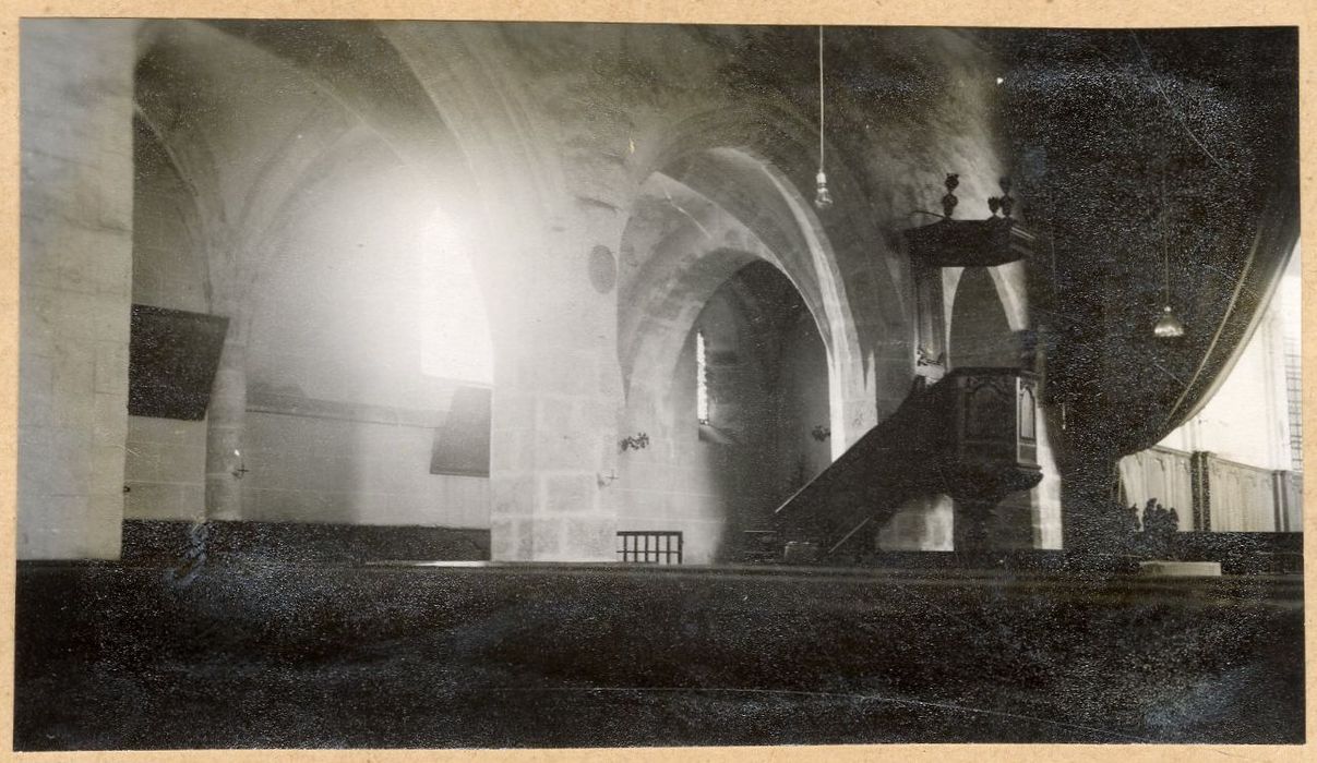 Abat-son avec colombes dans nuage et soleil (tête cassée) ; 4 pots à feu. 4 panneaux extérieurs sculptés et rinceaux. pieds sculptés, panneau arrière mouluré. Baquet sculpté de rinceaux, 5 coquilles. Même style et même époque que l'ensemble des boiseries. le plafond de l'abat-son s'effondre.