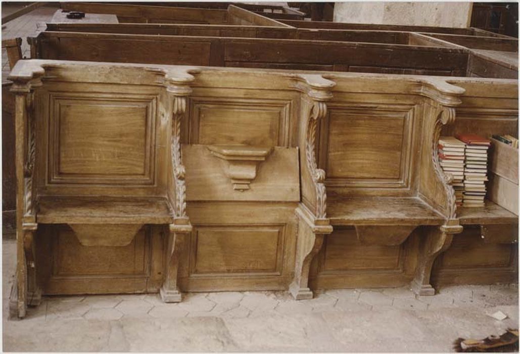Contre les bancs de la nef de l'église, à l'entrée du choeur.