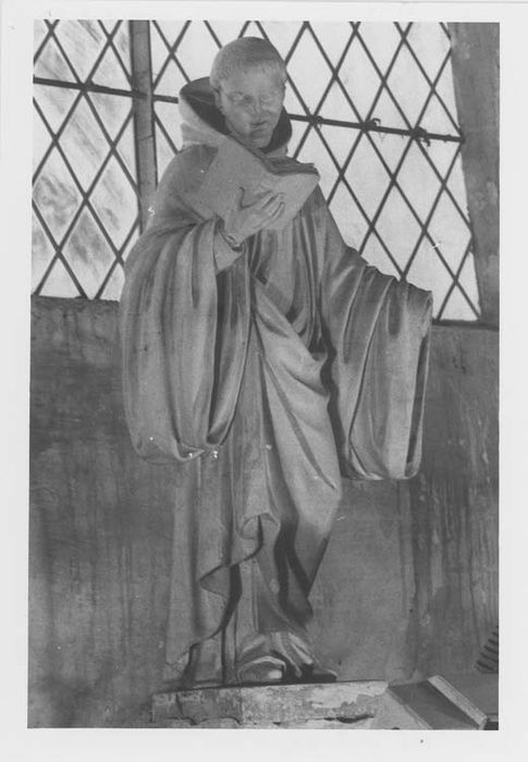 Saint Léonard à grande manche en train de lire, tenant dans la main droite le livre, robe drapée, costume de moine.