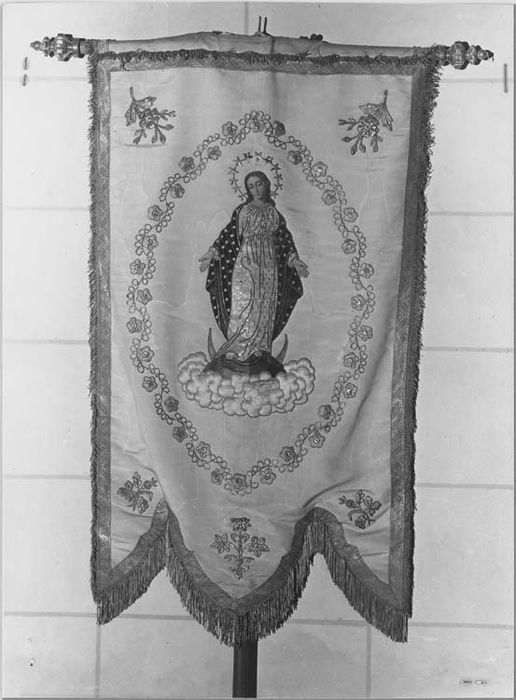 Bannière en damas rouge montée sur hampe. La tête, les mains et les pieds du Christ sont peints ; le corps du Christ est en laine flochée de fils d'or.