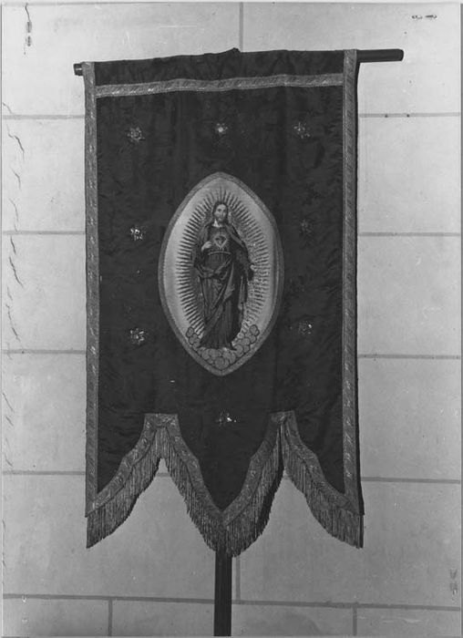 Bannière montée sur hampe. Tissu de fond : soie en moire à chemin beige, broderies en fil d'or, décor peint et rapporté (tête, pieds et mains de la Vierge), large galon doré à décor de palmettes, frange en fil d'or.