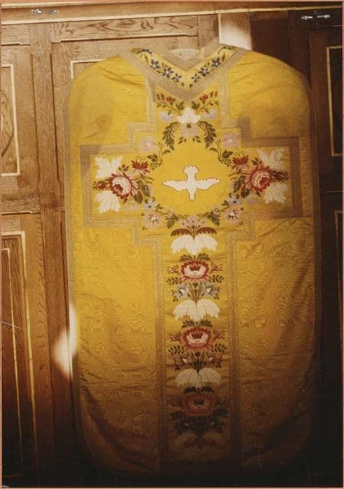 Chasuble en moire jaune ; galon fil d'or. Dos et devant de la chasuble : décor de bande de fleurs ; dos de la chasuble : colombe repiquée en médaillon central.