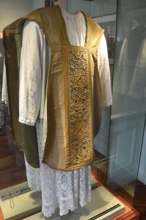 Inscription à l'intérieur de la doublure verte, écrite à la main à l'encre noire : chasuble donnée par l'Empereur. octobre 1868. souvenir de l'archevêque de Paris.