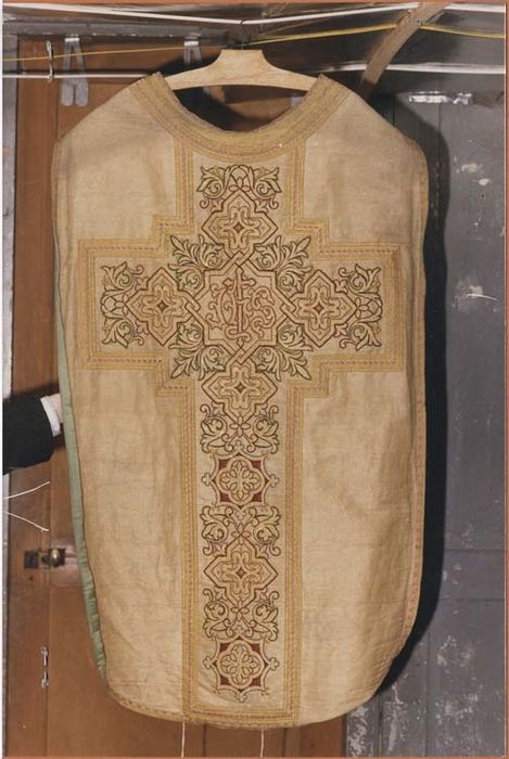 Chasuble en soie dorée avec une doublure verte. Motifs : entrelacés brodés : vert, noir, rouge, rose, violet et demies perles appliquées.