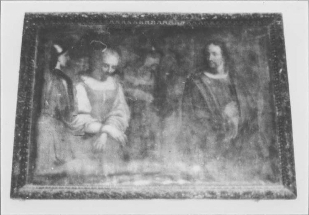 La femme adultère se tient devant le Christ au milieu des soldats ; les personnages sont peints à mi-corps.