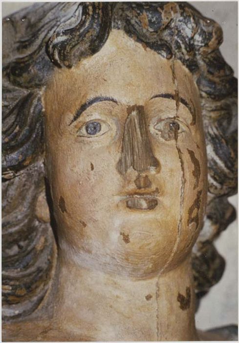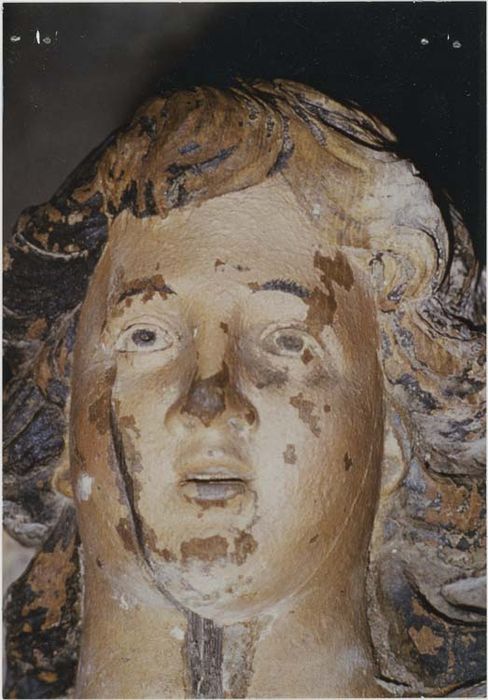 Fragments du retable du maître-autel. Il manque des bars, des jambes, un nez ; fente ; polychromie très abîmée.