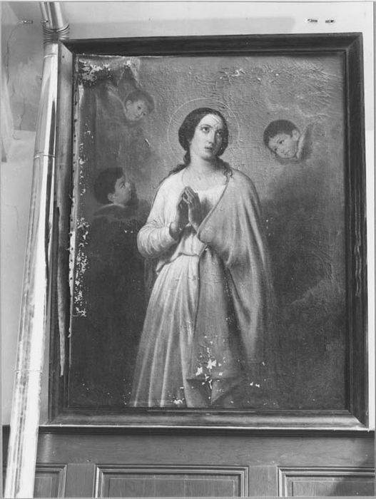 Composition très académique et figée : personnage féminin avec mains jointes et tête auréolée, au 1e plan, portant une robe et un manteau clairs, entourée de trois têtes d'anges ailées, sur un fond neutre