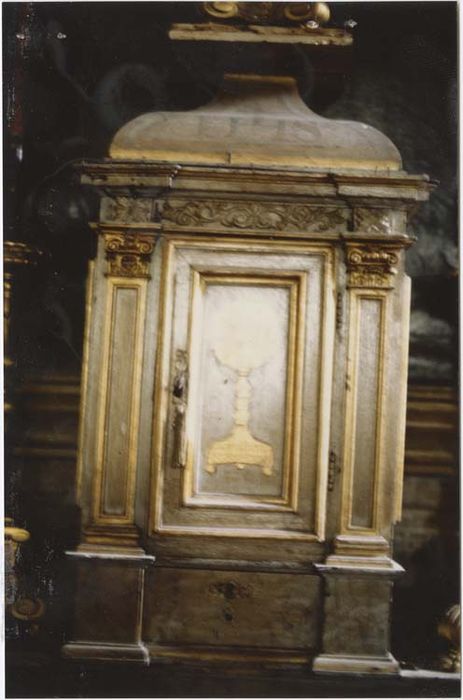 Bois peint en faux-marbre. Décor : acanthe ; volutes. Ostensoir sur la porte du tabernacle.
