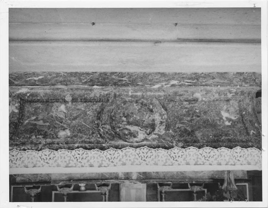 Autel en marbre veiné rouge. Retable architectural : encadré par deux pilastres cannelés à chapiteau ionique.