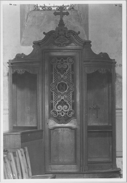 Loge centrale fermée par un battant très ouvragé, surmonté de volutes affrontés et sommés d'une croix ; panneau cintré vers le haut et à ressauts ; loges latérales ornées de fines moulures rondes et d'un petit motif de feuillages disposés en volutes.