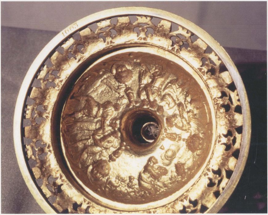 Fausse coupe argent ? Décor de rinceaux, feuillages, raisin, têtes d'angelots. Poids : 980 g.