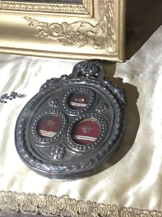 Métal argenté décoré de perles et surmonté d'arabesques. De forme ovale, 3 occuli, 3 reliques sur fond rouge. A l'intérieur ouvrable au dos : 3 compartiments.
