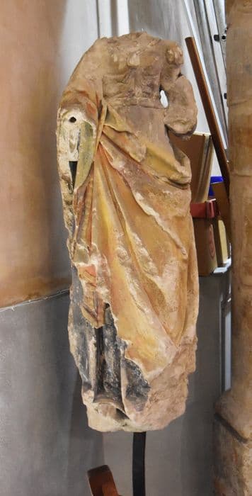 Statue représentant une femme, dont il manque la tête et les bras. Présence de dorure.