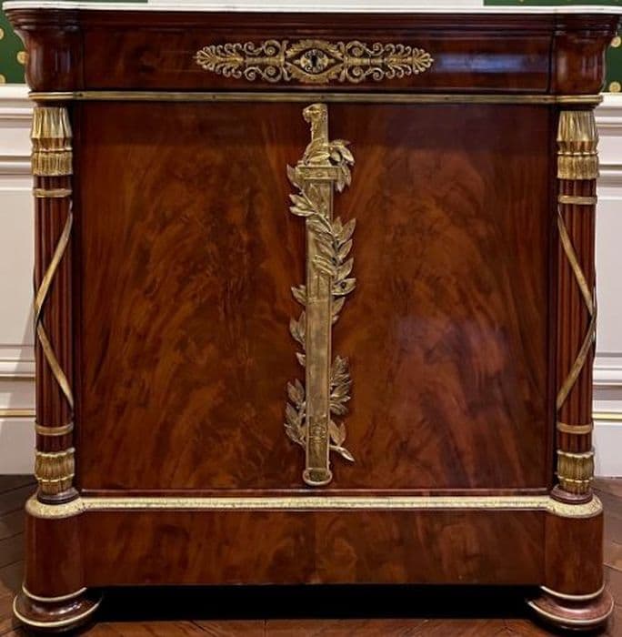 acajou flammé ; bronze : doré ; marbre (blanc)