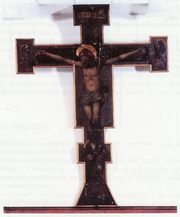 Tableau en forme de croix. Le Crucifix 'offre la curieuse combinaison d'une oeuvre monumentale en forme de croix latine et d'une composition peinte il y a moins de deux siècles. Lors de sa restauration entreprise en 1999, devant le constat de soulèvements et de l'état lacunaire de la couche picturale, cette association anachronique fut à l'origine de la recherche d'une composition plus ancienne par différentes investigations. L'étude du crucifix révéla trois états successifs : un premier état original associant support et couche peinte, puis deux repeints successifs datant vraisemblablement des XVIIe et XIXe siècles.' (Technè)