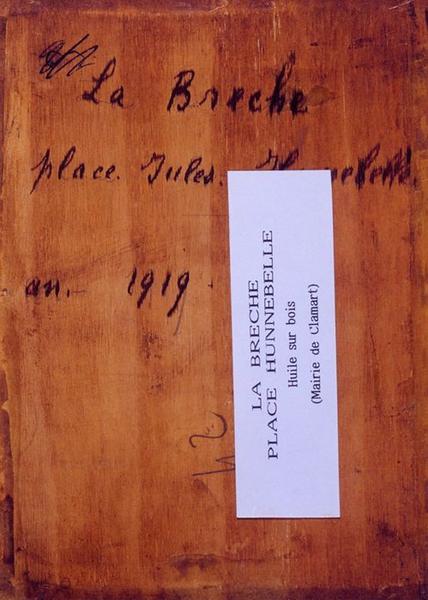 Signature (peinte, en bas à gauche) : C. Pape ; inscription et date (au revers) : La brèche place Jules Hunnebelle an 1919.