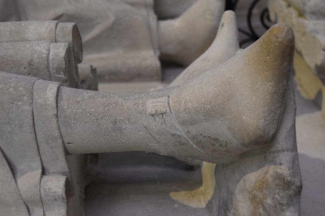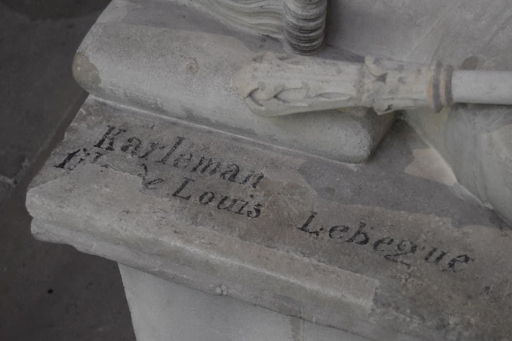 Statue funéraire. dalle funéraire à effigie en relief. Pierre de liais autrefois polychrome.