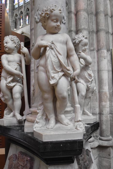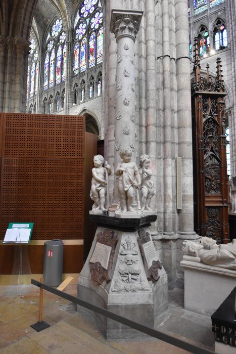 Œuvre exécutée entre 1562 et 1570. Le fils aîné d'Henri II et de Catherine de Médicis mourut à seize ans à Orléans, ville où le monument destiné à son coeur devait être érigé. En 1562, il fut décidé de le placer aux Célestins de Paris. Le chapiteau du sommet portait un vase de bronze contenant le coeur et un enfant tenant la couronne royale. Le projet primitif de cette sépulture, conçu par Le Primatice, fut amoindri. On utilisa trois des génies funéraires exécutés pour le tombeau de François Ier par Jacquio Ponce. C'est Jean Leroux qui est l'auteur de la décoration du piédestal.