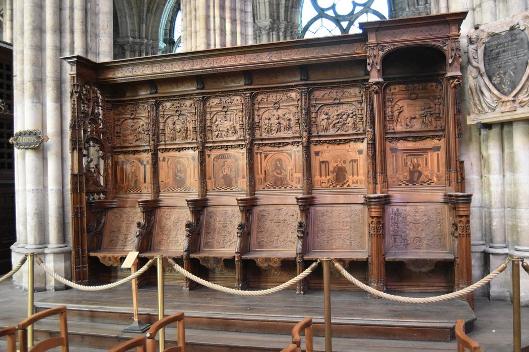 Les deux rangées de stalles à hauts dossiers ainsi que la grande chaire isolée au côté droit, viennent de la chapelle du château de Gaillon, constuite de 1504 à 1509.